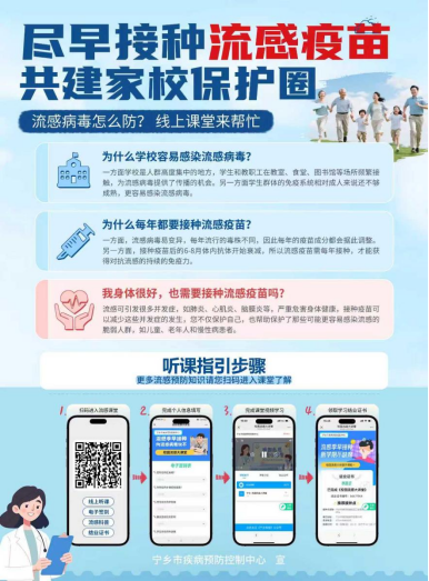 秋冬流感高发季临近,为筑牢校园健康防线,保障师生身体健康与教学秩序,2025 年 9 月 23 日,宁乡市疾病预防控制中心到长沙文创艺术职业学院,正式启动 “尽早接种流感疫苗,共建家校健康保护圈” 主题流感防控宣教活动,通过线上线下联动模式,向师生及家长普及科学防控知识,倡导主动接种流感疫苗。