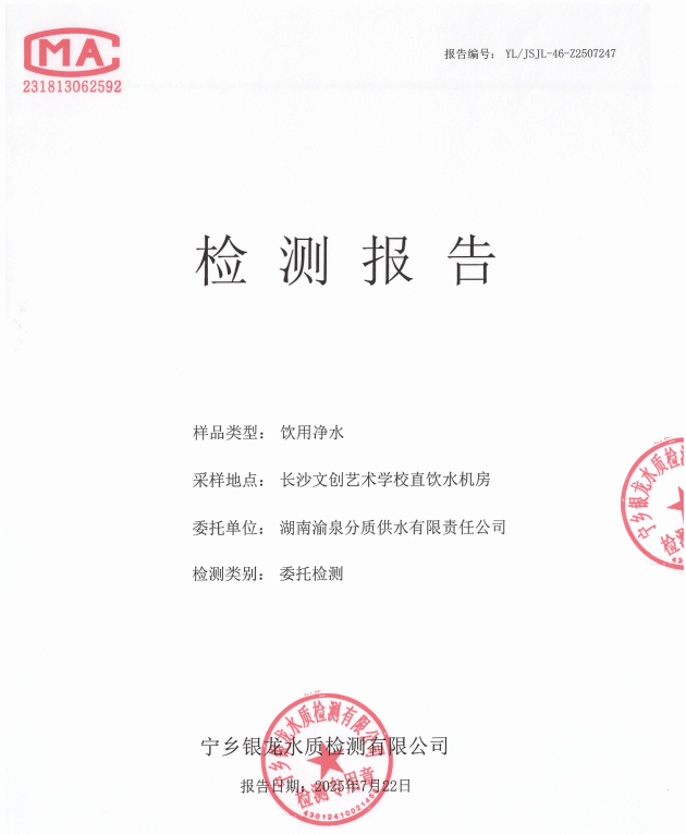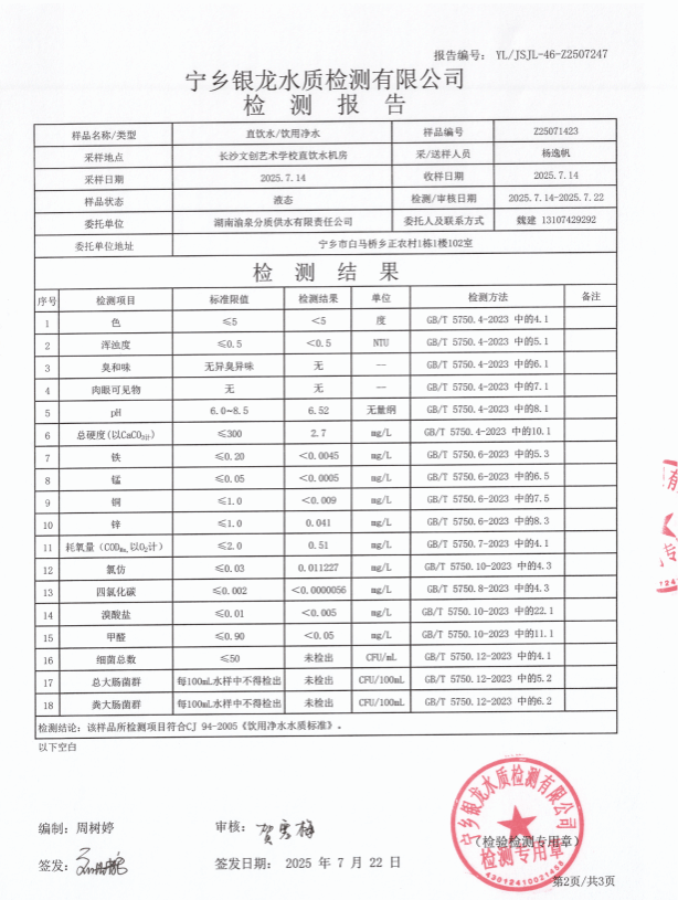 2025年7月长沙文创艺术学校直饮水检测报告